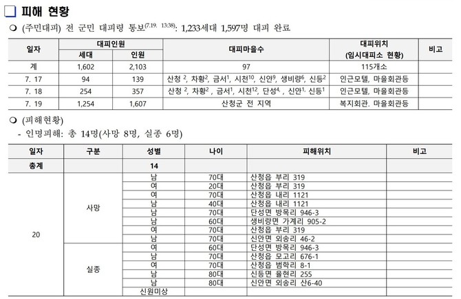 인명 피해는 사망 8명이며 실종자 수는 6명이다. 피해시설 규모는 425억원 정도로 현재까지 집계됐다.  경남도와 산청군은 인력 660명, 장비 55대를 동원해 긴급복구에 힘을 쏟고 있다.