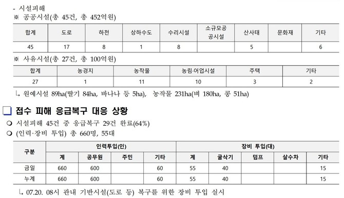 피해상황 집계 사실상 어려워…피해시설 425억원, 경남도-산청군 인력 660명, 장비 55대 동원 복구총력