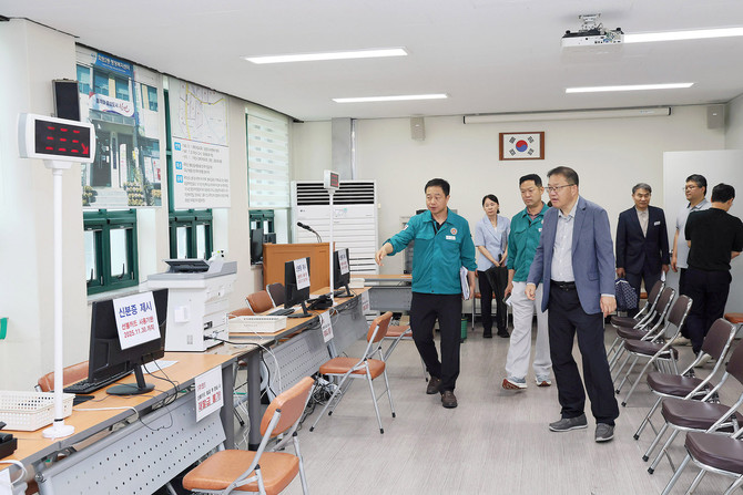 장금용 권한대행은 각 동의 회의실에 설치된 접수창구를 둘러보며 △PC 및 복합기 등 장비 설치 상태 △순번 대기 시스템 작동 여부 △대기공간 및 냉방장비 운영 현황 △폭염 대응물품 비치 여부 등을 살폈다.