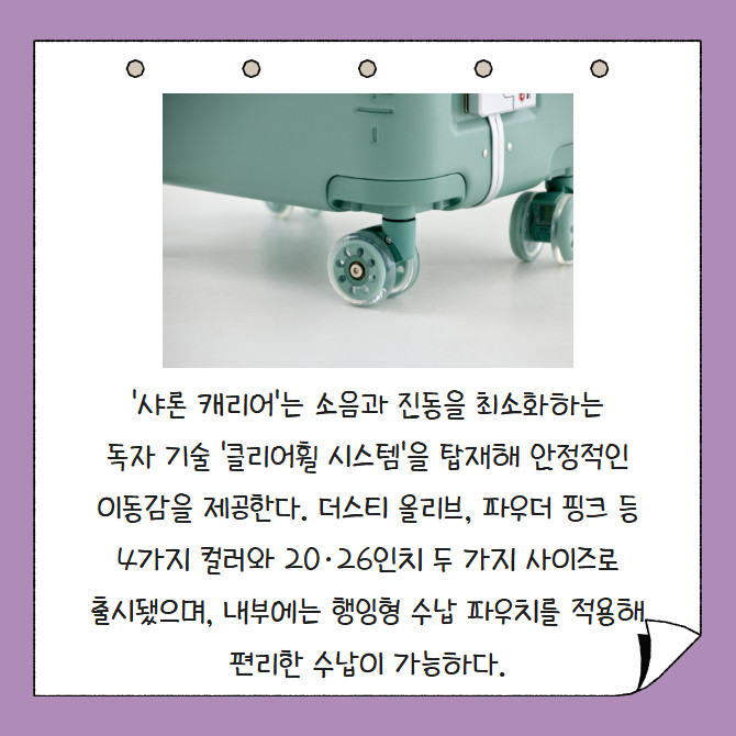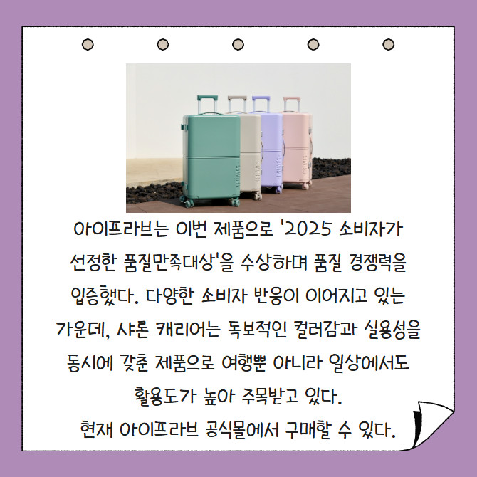 [프라임경제] 국내 캐리어 브랜드 아이프라브의 신제품 '샤론 캐리어'가 지난 17일 SBS Life '안목의 여왕 김남주'에 등장해 시청자들의 관심을 끌었다. 이날 방송에서는 팀 김남주가 단합대회를 떠나며 단체 캐리어로 '샤론 캐리어'를 선택한 모습이 그려졌고, 감각적인 컬러와 깔끔한 내부 구성으로 화제를 모았다.