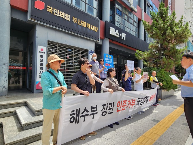 [프라임경제] 동북아허브공항국민행동본부 등 6개 단체가 21일 오전 부산 수영구 소재의 국민의힘 부산광역시당을 찾아 해수부 장관 인준 거부 상황을 규탄하고 나섰다.