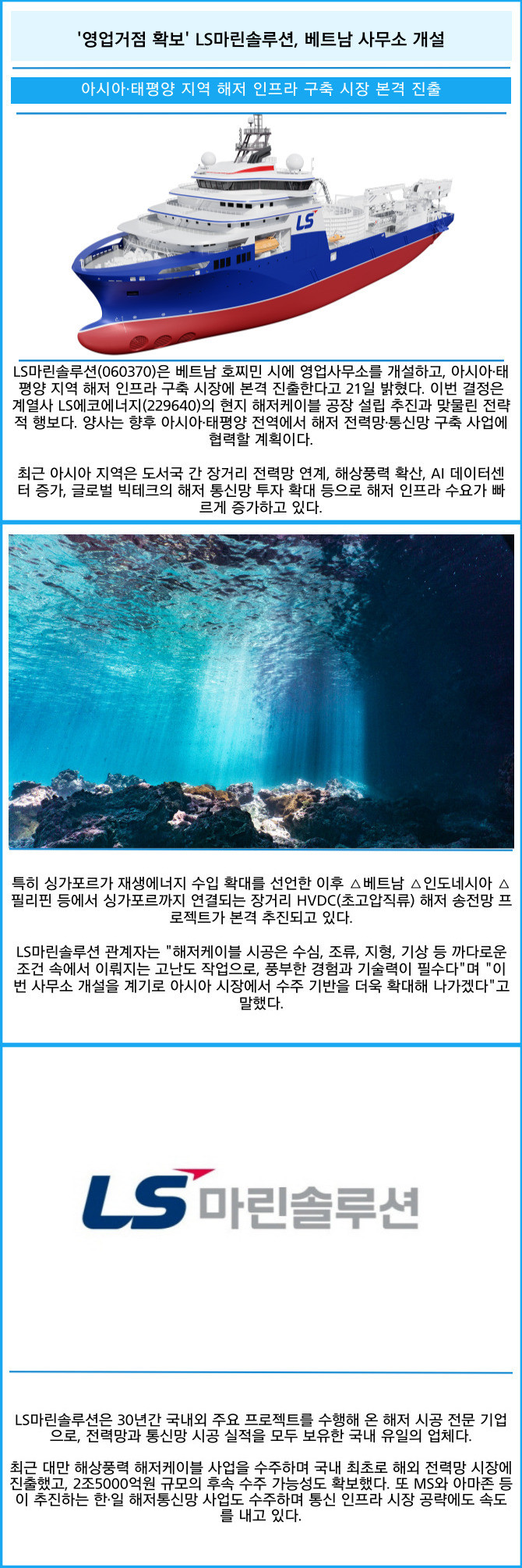 [프라임경제] LS마린솔루션(060370)은 베트남 호찌민 시에 영업사무소를 개설하고, 아시아·태평양 지역 해저 인프라 구축 시장에 본격 진출한다고 21일 밝혔다. 이번 결정은 계열사 LS에코에너지(229640)의 현지 해저케이블 공장 설립 추진과 맞물린 전략적 행보다. 양사는 향후 아시아·태평양 전역에서 해저 전력망·통신망 구축 사업에 협력할 계획이다.
