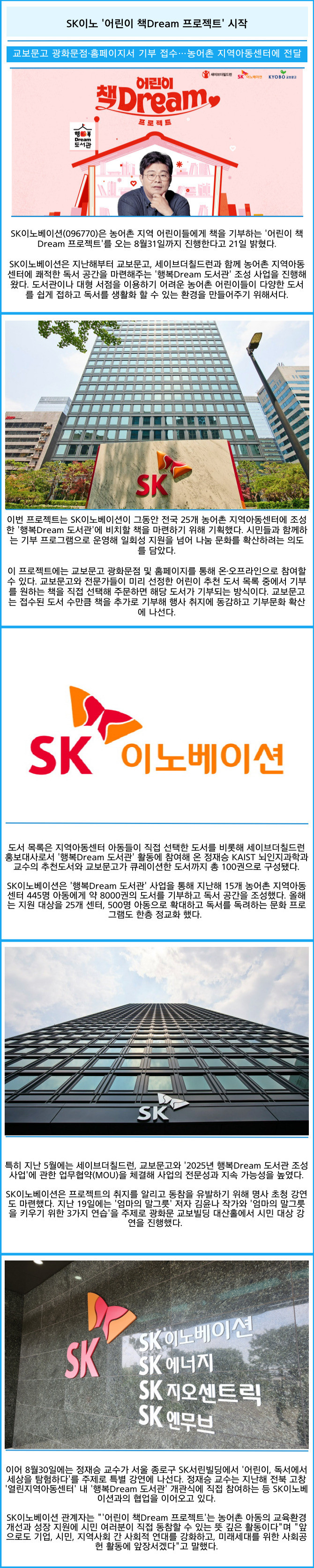 [프라임경제] SK이노베이션(096770)은 농어촌 지역 어린이들에게 책을 기부하는 '어린이 책Dream 프로젝트'를 오는 8월31일까지 진행한다고 21일 밝혔다.