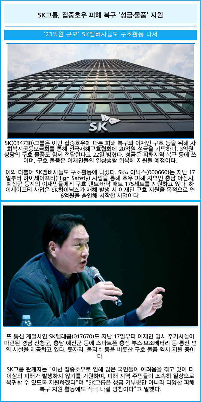 [프라임경제] SK(034730)그룹은 이번 집중호우에 따른 피해 복구와 이재민 구호 등을 위해 사회복지공동모금회를 통해 전국재해구호협회에 20억원 성금을 기탁하며, 3억원 상당의 구호 물품도 함께 전달한다고 22일 밝혔다. 성금은 피해지역 복구 등에 쓰이며, 구호 물품은 이재민들의 일상생활 회복에 지원될 예정이다.