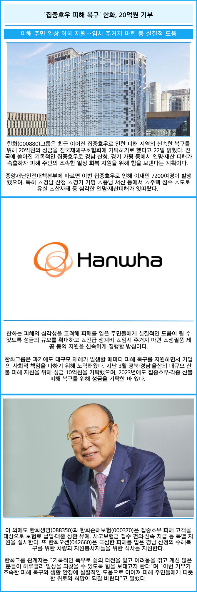 [프라임경제] 한화(000880)그룹은 최근 이어진 집중호우로 인한 피해 지역의 신속한 복구를 위해 20억원의 성금을 전국재해구호협회에 기탁하기로 했다고 22일 밝혔다. 전국에 쏟아진 기록적인 집중호우로 경남 산청, 경기 가평 등에서 인명·재산 피해가 속출하자 피해 주민의 조속한 일상 회복 지원을 위해 힘을 보탠다는 계획이다.