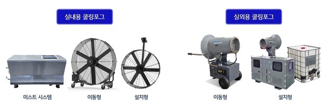 실내용의 경우 물 입자를 분사하는 미스트 팬을 천장이나 벽에 설치할 수 있어 작업장의 공간 효율성을 높인다. 실외용 제품은 설치형과 바퀴가 부착된 이동형으로 나뉘며 설치형은 트럭과 같은 차량에 탑재해 운용할 수도 있다.