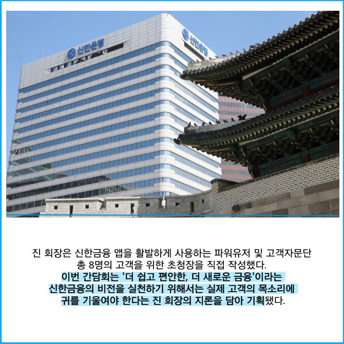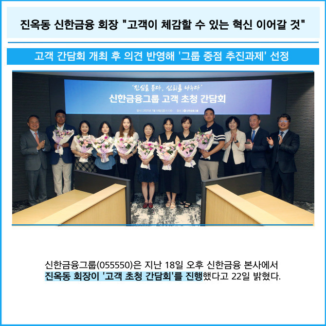 [프라임경제] 신한금융그룹(055550)은 지난 18일 오후 신한금융 본사에서 진옥동 회장이 '고객 초청 간담회'를 진행했다고 22일 밝혔다.