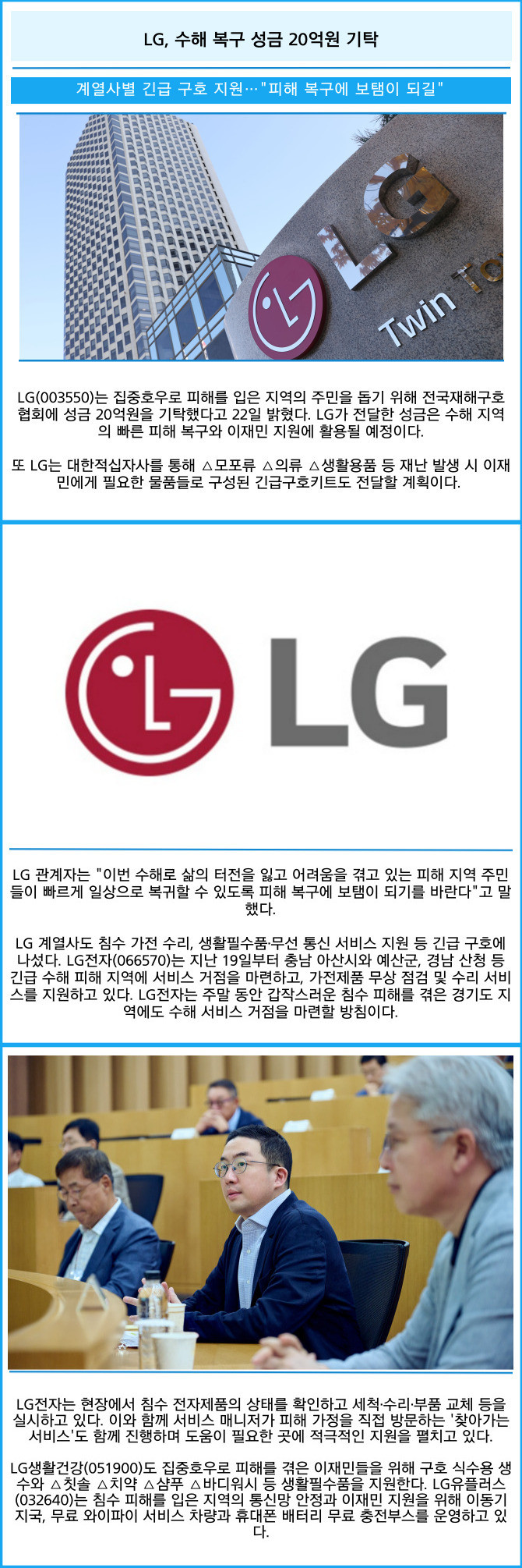 [프라임경제] LG(003550)는 집중호우로 피해를 입은 지역의 주민을 돕기 위해 전국재해구호협회에 성금 20억원을 기탁했다고 22일 밝혔다. LG가 전달한 성금은 수해 지역의 빠른 피해 복구와 이재민 지원에 활용될 예정이다.