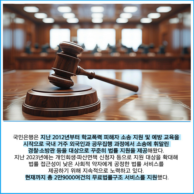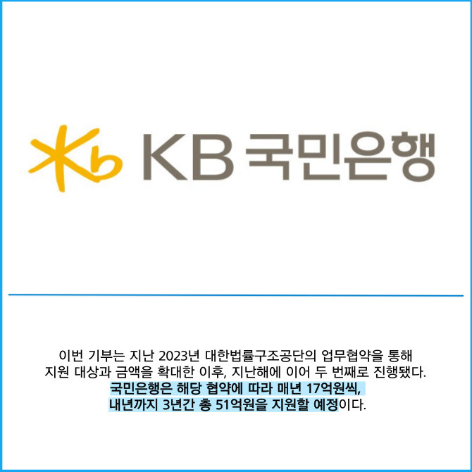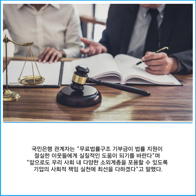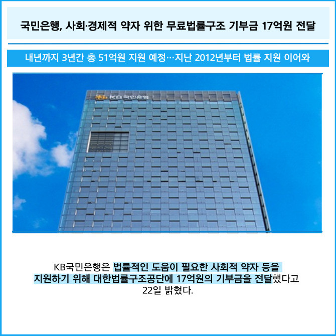 [프라임경제] KB국민은행은 법률적인 도움이 필요한 사회적 약자 등을 지원하기 위해 대한법률구조공단에 17억원의 기부금을 전달했다고 22일 밝혔다.