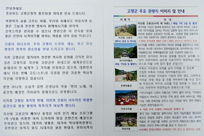서한문에는 고령군의 우수한 영상 촬영 장소의 사진과 각종 자료를 첨부해 제작자들이 고령군의 빼어난 촬영 스팟을 시각적으로 볼 수 있게 했다.