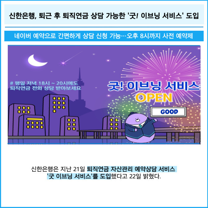 [카드] 신한은행, 퇴근 후 퇴직연금 상담 가능한 '굿! 이브닝 서비스' 도입