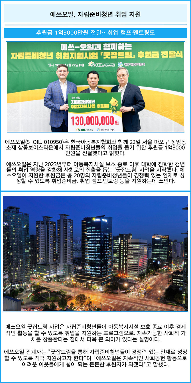 [프라임경제] 에쓰오일(S-OIL, 010950)은 한국아동복지협회와 함께 22일 서울 마포구 상암동 소재 삼동보이스타운에서 자립준비청년들의 취업을 돕기 위한 후원금 1억3000만원을 전달했다고 밝혔다.