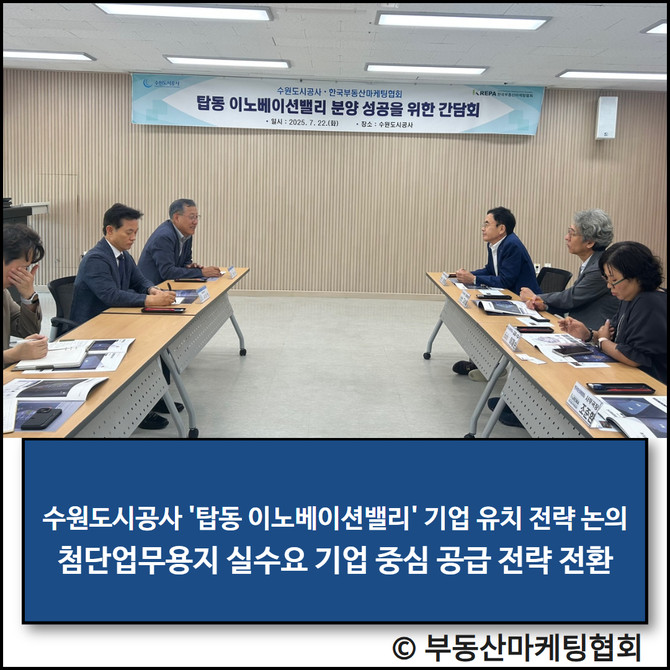 수원도시공사가 '탑동 이노베이션밸리 첨단업무용지'의 성공적인 분양을 위해 한국부동산마케팅협회와 간담회를 열었다. 전문가들은 실수요 기업 유치 전략에 집중할 것을 제안했다.