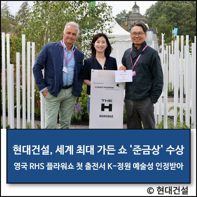 현대건설(000720)이 세계적 권위 'RHS 플라워쇼 웬트워스 우드하우스 2025'에서 실버길트 메달을 수상했다. 이번 쇼에서는 성균관대학교와 함께 작업한 '정원이 속삭이다'가 쇼가든 부문에서 주목받았다.