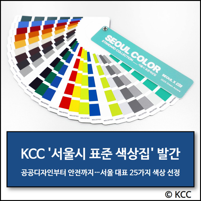 KCC(002380)가 서울시와 협력해 '서울시 표준 색상집'을 제작·배포했다. 이번 색상집은 서울시 정체성을 살린 공공디자인과 안전을 위한 컬러 가이드를 제공하기 위한 것이다. 이에 도시 미관과 시민 안전을 고려한 25개 색상이 수록됐다.
