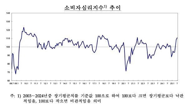 CCSI는 지난해 7~11월까지 100 이상을 기록했다가 지난해 12월 계엄 사태 여파로 88.2로 급락했다. 이후 지난 4월부터 오르기 시작해 이달까지 4개월 연속 상승세를 보이고 있다.
