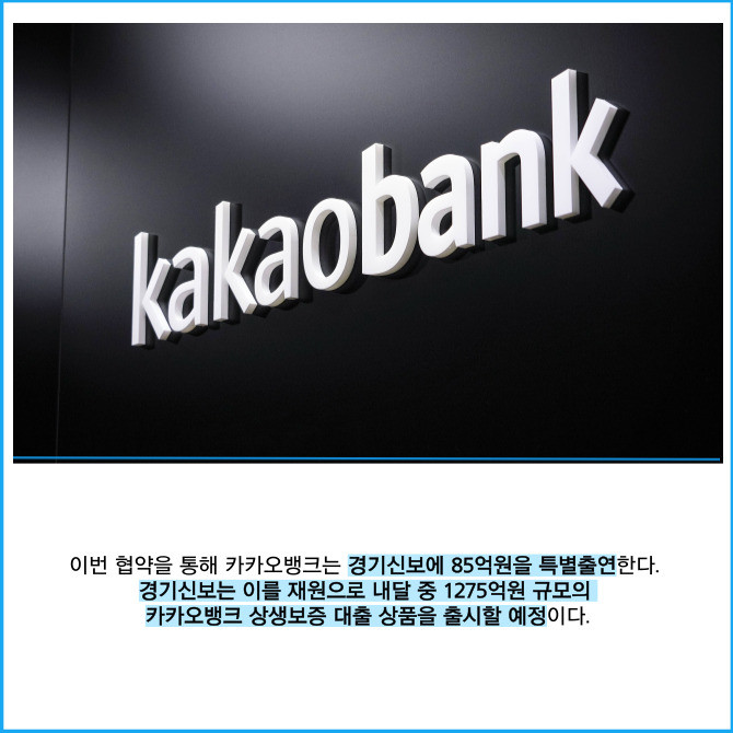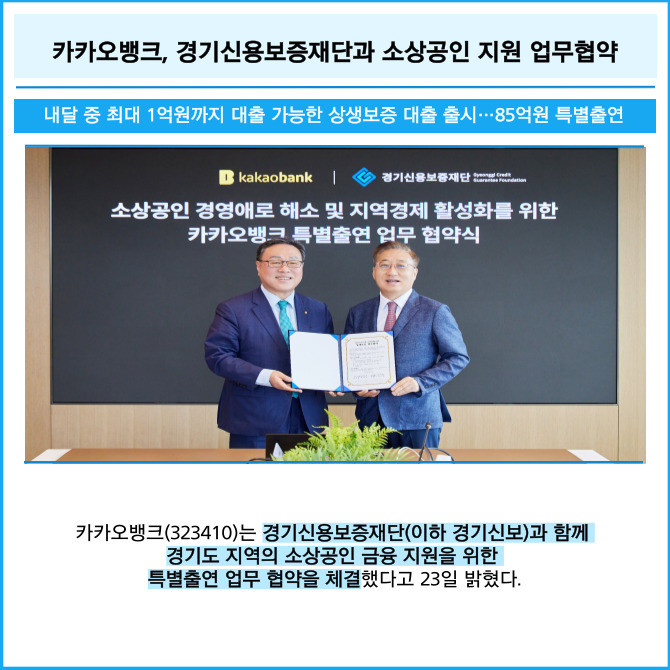 [프라임경제] 카카오뱅크(323410)는 경기신용보증재단(이하 경기신보)과 함께 경기도 지역의 소상공인 금융 지원을 위한 특별출연 업무 협약을 체결했다고 23일 밝혔다.