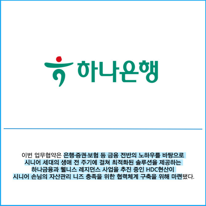 [프라임경제] 하나은행은 지난 22일 HDC현대산업개발(이하 HDC현산)과 웰니스 레지던스 사업 활성화 및 입주자 맞춤형 종합자산관리 서비스 제공을 위한 업무협약(MOU)을 체결했다고 23일 밝혔다.