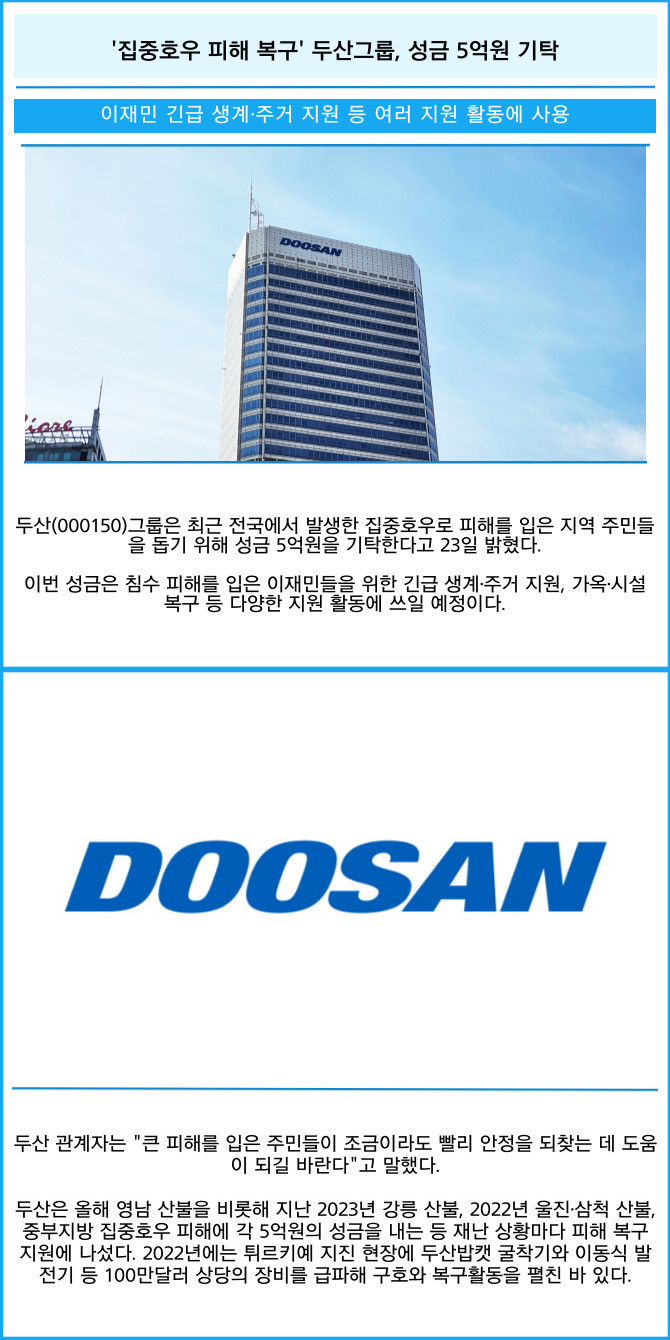 [프라임경제] 두산(000150)그룹은 최근 전국에서 발생한 집중호우로 피해를 입은 지역 주민들을 돕기 위해 성금 5억원을 기탁한다고 23일 밝혔다.