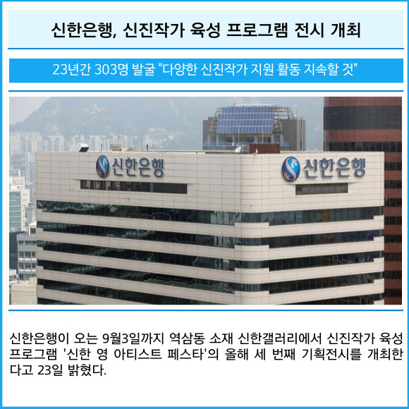 [프라임경제] 신한은행이 오는 9월3일까지 역삼동 소재 신한갤러리에서 신진작가 육성 프로그램 '신한 영 아티스트 페스타'의 올해 세 번째 기획전시를 개최한다고 23일 밝혔다.