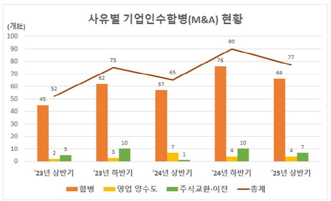 M&A 사유로는 합병이 66곳(85.7%)으로 압도적인 비중을 차지했으며, 주식 교환·이전이 7곳(9.1%), 영업 양수도가 4곳(5.2%)으로 뒤를 이었다.