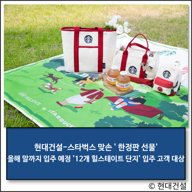 '힐스테이트X스타벅스 패밀리 펫 세트'는 매쉬 소재를 적용한 반려견 하네스백과 분리형 칸막이를 갖춘 토트백으다. '힐스테이트X스타벅스 피크닉 매트 세트'는 단지 풍경이 담긴 생활방수 피크닉 매트와 숄더백으로 각각 구성됐다.
