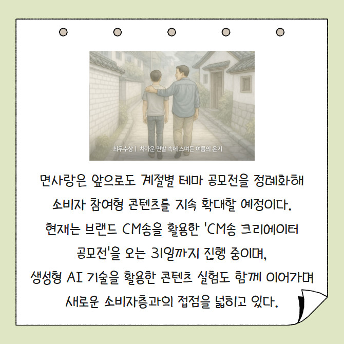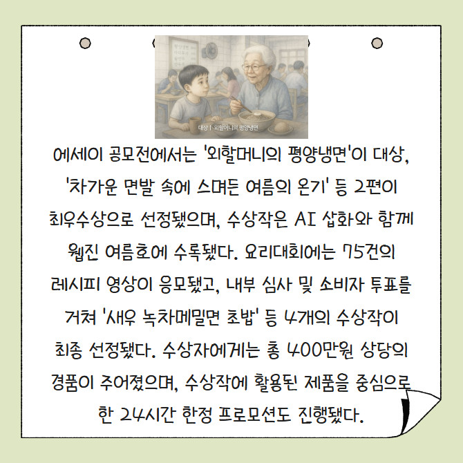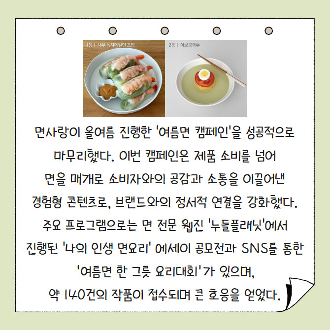 [프라임경제] 면사랑이 올여름 진행한 '여름면 캠페인'을 성공적으로 마무리했다. 이번 캠페인은 제품 소비를 넘어 면을 매개로 소비자와의 공감과 소통을 이끌어낸 경험형 콘텐츠로, 브랜드와의 정서적 연결을 강화했다. 주요 프로그램으로는 면 전문 웹진 '누들플래닛'에서 진행된 '나의 인생 면요리' 에세이 공모전과 SNS를 통한 ‘여름면 한 그릇 요리대회’가 있으며, 약 140건의 작품이 접수되며 큰 호응을 얻었다.