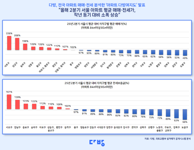 부동산 정보 플랫폼 '다방'이 발표한 2025년 2분기 아파트 다방여지도에 따르면, 서울 지역 전용 84㎡ 아파트 평균 매매가는 13억2666만원, 평균 전세보증금은 6억8036만원이다. 이는 전년대비 매매가는 1.2%, 전세보증금은 4.9% 상승한 수치다.