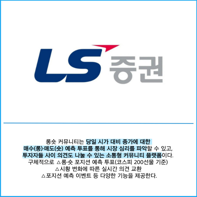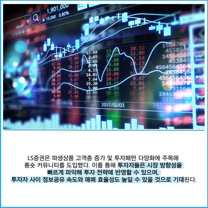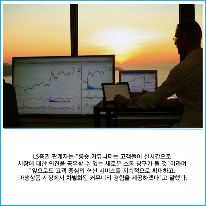 [프라임경제] LS증권(078020)은 파생상품 투자자들이 실시간으로 의견을 공유할 수 있는 '롱숏 커뮤니티'를 새롭게 선보였다고 30일 밝혔다.