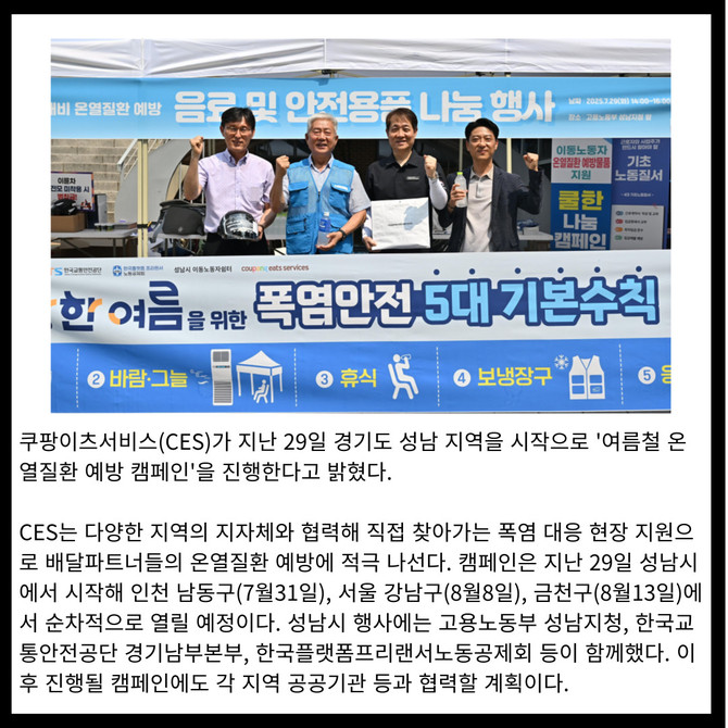 [프라임경제] 쿠팡이츠서비스(CES)가 지난 29일 경기도 성남 지역을 시작으로 '여름철 온열질환 예방 캠페인'을 진행한다고 밝혔다.
