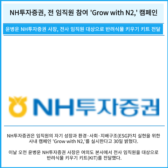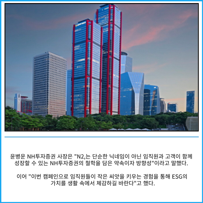 [프라임경제] NH투자증권(005940)은 임직원의 자기 성장과 환경·사회·지배구조(ESG) 가치 실현을 위한 사내 캠페인 'Grow with N2,'를 실시한다고 30일 밝혔다.