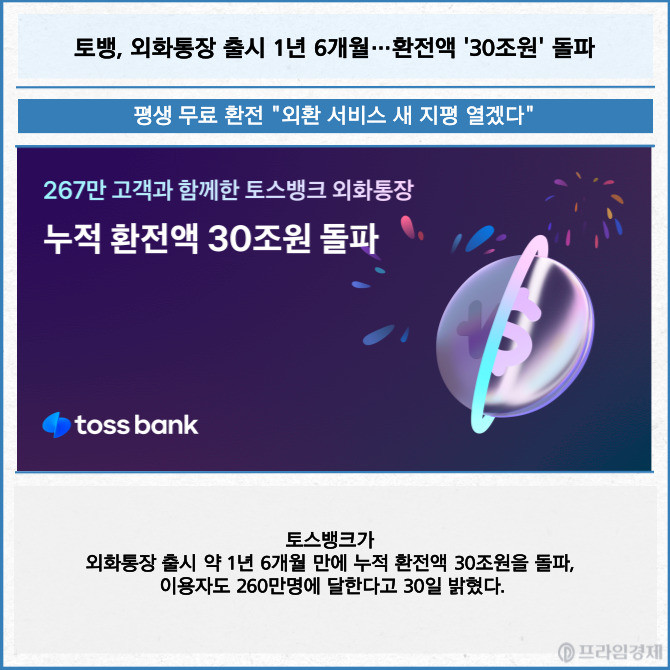 [프라임경제] 토스뱅크가 외화통장 출시 약 1년 6개월 만에 누적 환전액 30조원을 돌파, 이용자도 260만명에 달한다고 30일 밝혔다.