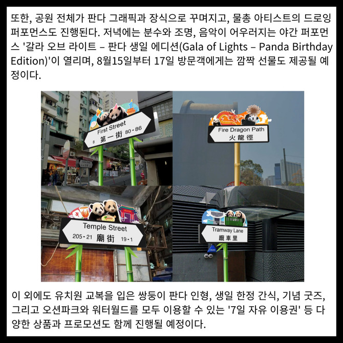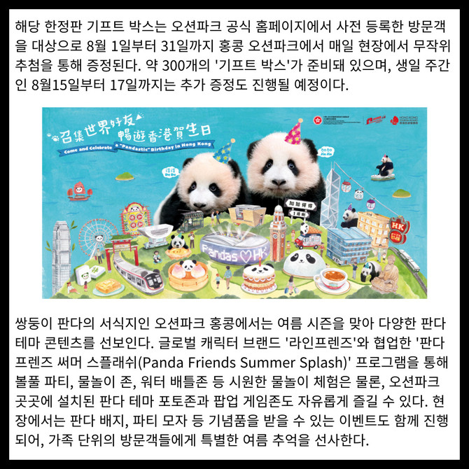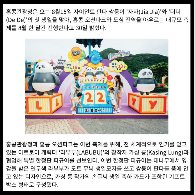 [프라임경제] 홍콩관광청은 오는 8월15일 자이언트 판다 쌍둥이 '자자(Jia Jia)'와 '더더(De De)'의 첫 생일을 맞아, 홍콩 오션파크와 도심 전역을 아우르는 대규모 축제를 8월 한 달간 진행한다고 30일 밝혔다.