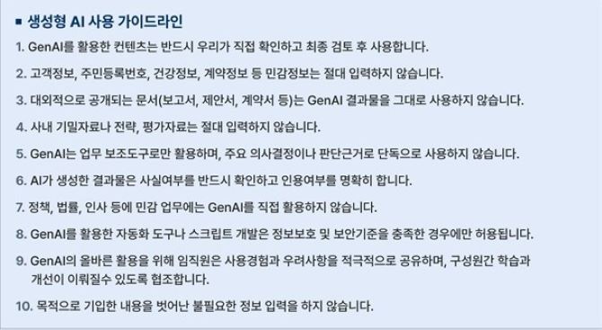 아울러, 실무 적용을 위한 10개 세부 가이드라인도 함께 운영된다. 주요 내용은 민감정보 입력 금지, 무분별한 결과물 활용 자제, 지속적 교육과 책임 있는 사용 문화 조성 등이다.