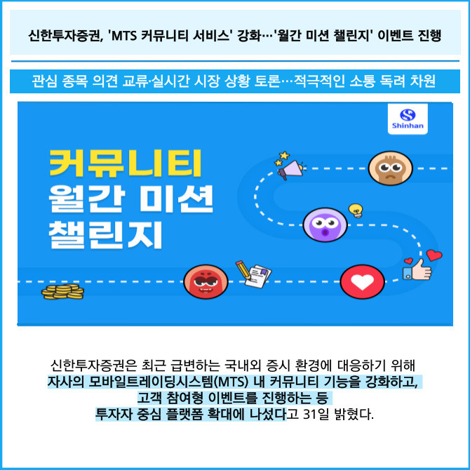 [프라임경제] 신한투자증권은 최근 급변하는 국내외 증시 환경에 대응하기 위해 자사의 모바일트레이딩시스템(MTS) 내 커뮤니티 기능을 강화하고, 고객 참여형 이벤트를 진행하는 등 투자자 중심 플랫폼 확대에 나섰다고 31일 밝혔다.
