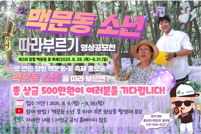 이번 공모전은 8월4일부터 18일까지 진행되며, 참가자는 AI가 부른 축제 홍보송 '맥문동 소년'을 따라 부른 영상을 촬영해 제출하면 된다. 최우수상 1편에는 상금 100만원이 수여되는 등, 총 500만원의 상금이 걸려 있다. 참가 방법 및 세부 내용은 서천군청 누리집 공지사항에서 확인할 수 있다.