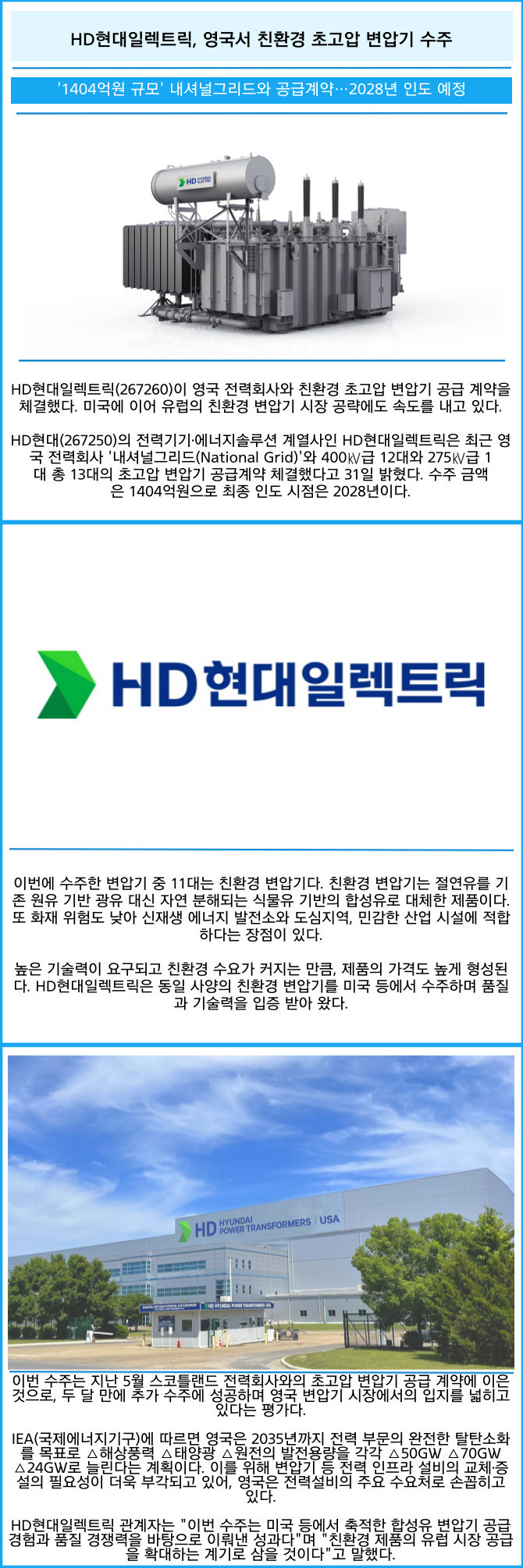 HD현대(267250)의 전력기기·에너지솔루션 계열사인 HD현대일렉트릭은 최근 영국 전력회사 '내셔널그리드(National Grid)'와 400㎸급 12대와 275㎸급 1대 총 13대의 초고압 변압기 공급계약 체결했다고 31일 밝혔다. 수주 금액은 1404억원으로 최종 인도 시점은 2028년이다.