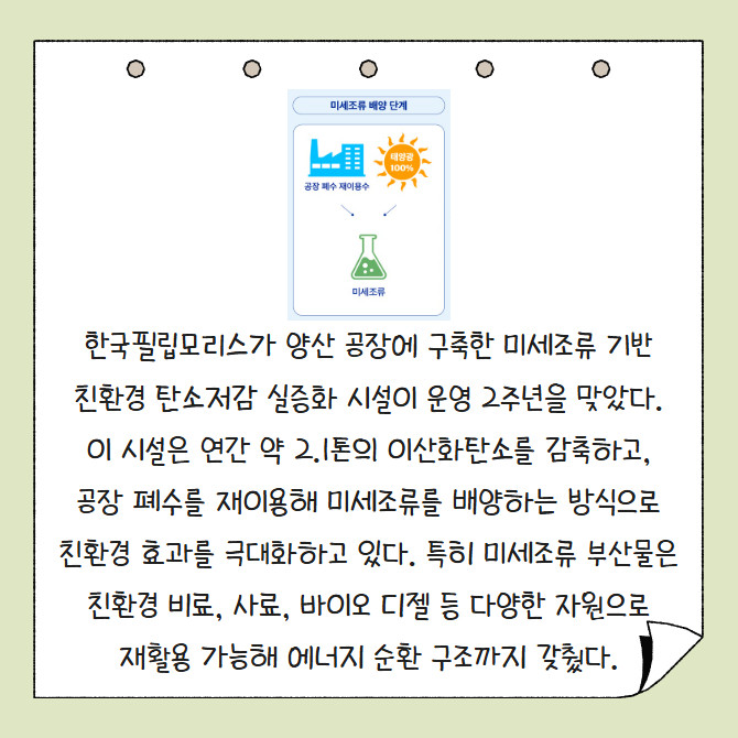 [프라임경제] 한국필립모리스가 양산 공장에 구축한 미세조류 기반 친환경 탄소저감 실증화 시설이 운영 2주년을 맞았다. 이 시설은 연간 약 2.1톤의 이산화탄소를 감축하고, 공장 폐수를 재이용해 미세조류를 배양하는 방식으로 친환경 효과를 극대화하고 있다. 특히 미세조류 부산물은 친환경 비료, 사료, 바이오 디젤 등 다양한 자원으로 재활용 가능해 에너지 순환 구조까지 갖췄다.