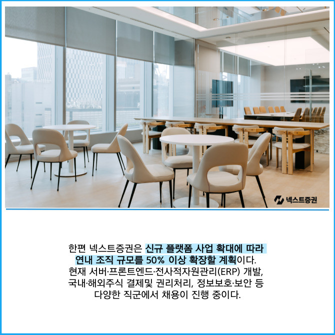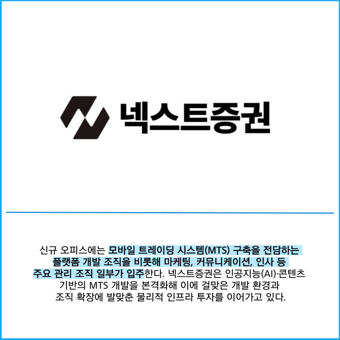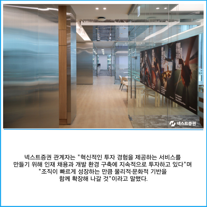 [프라임경제] 넥스트증권은 여의도 Three IFC 오피스를 확장 오픈하고, 신규 조직 수용을 위한 인프라 확대에 나섰다고 1일 밝혔다. 이번 오피스 확장은 빠르게 성장 중인 플랫폼 개발 조직과 관리 부문의 공간 수요를 반영한 조치다.