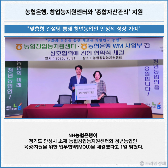 [프라임경제] NH농협은행이 경기도 안성시 소재 농협창업농지원센터와 청년농업인 육성·지원을 위한 업무협약(MOU)을 체결했다고 1일 밝혔다.