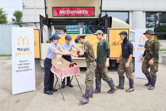 한국맥도날드는 최근 집중호우로 큰 피해를 입은 경남 산청, 충남 예산, 경기 가평 지역의 복구 현장에 '행복의 버거'와 '맥카페' 음료트럭을 지원했다.