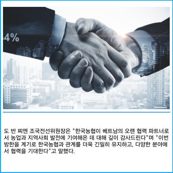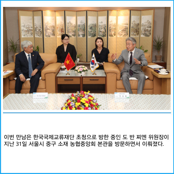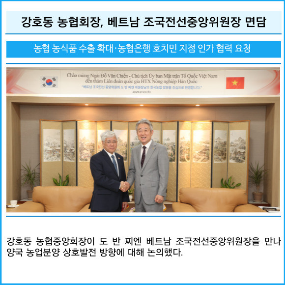 [프라임경제] 강호동 농협중앙회장이 도 반 찌엔 베트남 조국전선중앙위원장을 만나 양국 농업분양 상호발전 방향에 대해 논의했다.