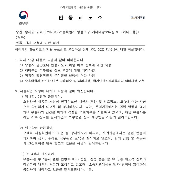 안동교도소는 2025년 7월16일 본지가 발송한 취재 공문에 대해 7월22일 회신을 보내왔다. 그러나 회신공문에는 본지가 질의한 △의료거부 또는 보류사유 △자비 진료 요청에 대한 수용기관 입장 △직원 언행에 대한 사실관계 등 핵심 질문에 대해 명확한 사실 확인 없이 원론적 법령 안내와 절차 진행 중이라는 답변만이 담겨있었다.