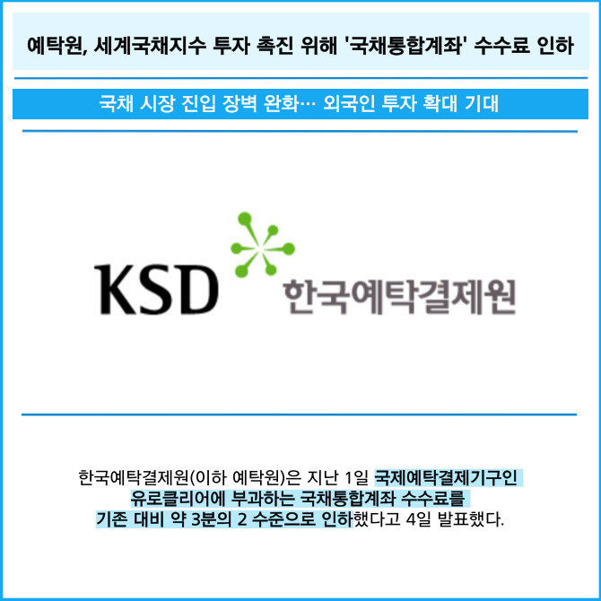 [프라임경제] 한국예탁결제원(이하 예탁원)은 지난 1일 국제예탁결제기구인 유로클리어에 부과하는 국채통합계좌 수수료를 기존 대비 약 3분의 2 수준으로 인하했다고 4일 발표했다.