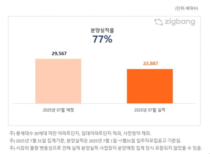 앞서 7월 분양시장은 '6.27 대출규제' 변수 속에서도 실적 면에서는 예상외의 선전을 이뤄냈다. 당초 2만9567세대가 예정됐지만, 실제 분양은 2만2887세대(실적률 77%)를 기록한 것이다.