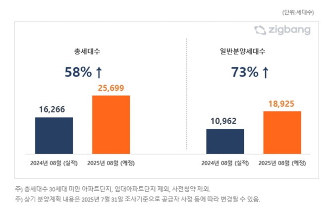 직방에 따르면 8월 한 달간 전국에서 전년(1만6266세대)대비 약 58% 증가한 2만5699세대가 분양 체제에 돌입한다. 일반분양 물량만 해도 73%나 늘어난 1만8925세대다.