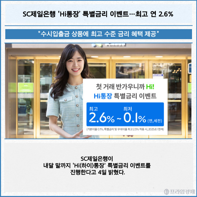 [프라임경제] SC제일은행이 내달 말 까지 'Hi(하이)통장' 특별금리 이벤트를 진행한다고 4일 밝혔다.