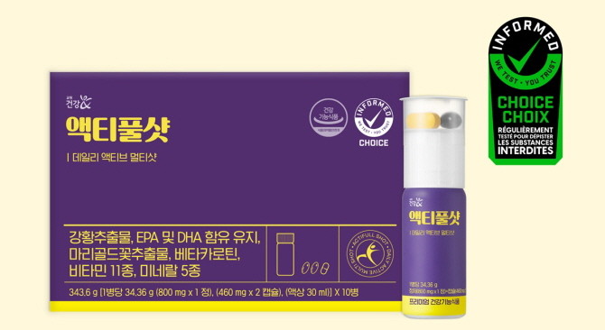 액티풀샷은 차의과학대학교 스포츠의학과 홍정기 교수와 공동 개발한 이중 제형 건강기능식품이다. 근력 개선에 도움을 주는 개별인정형 원료 '강황추출물'을 함유한 정제, 눈 건강과 혈행 개선을 고려한 캡슐, 비타민B군이 담긴 액상 제형으로 구성돼 있다. 강황추출물은 인체적용시험 결과, 대퇴 근력과 악력 개선 등 유의미한 효과가 입증됐다.