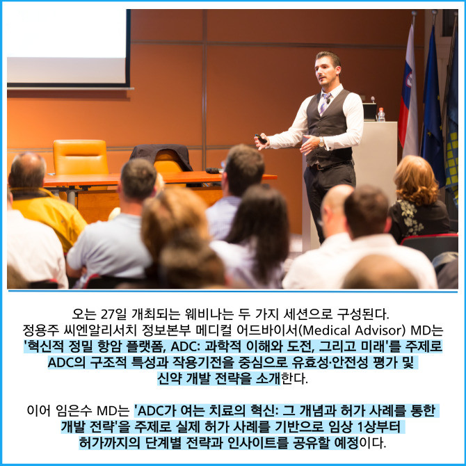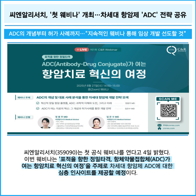 [프라임경제] 씨엔알리서치(359090)는 첫 공식 웨비나를 연다고 4일 밝혔다. 이번 웨비나는 '표적을 향한 정밀타격, 항체약물접합체(ADC)가 여는 항암치료 혁신의 여정'을 주제로 차세대 ADC에 대한 심층 인사이트를 제공할 예정이다.