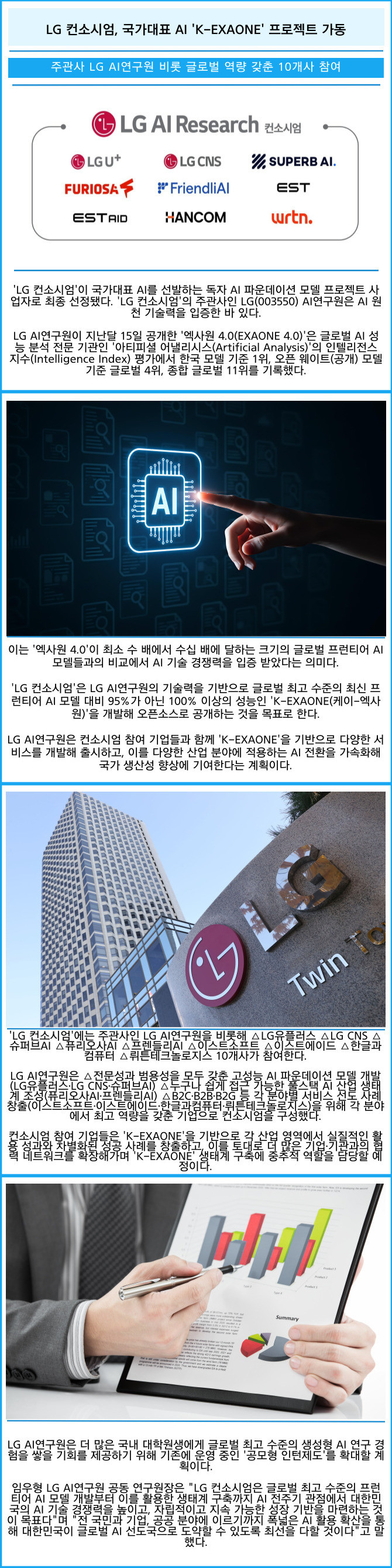 [프라임경제] 'LG 컨소시엄'이 국가대표 AI를 선발하는 독자 AI 파운데이션 모델 프로젝트 사업자로 최종 선정됐다. 'LG 컨소시엄'의 주관사인 LG(003550) AI연구원은 AI 원천 기술력을 입증한 바 있다.
